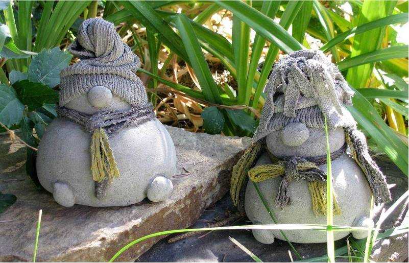 Вырезаем из ткани заготовки необходимого размера, смачиваем цементным раствором и одеваем нашего гномика. После полного застывания состава поделку раскрашиваем по вкусу.
