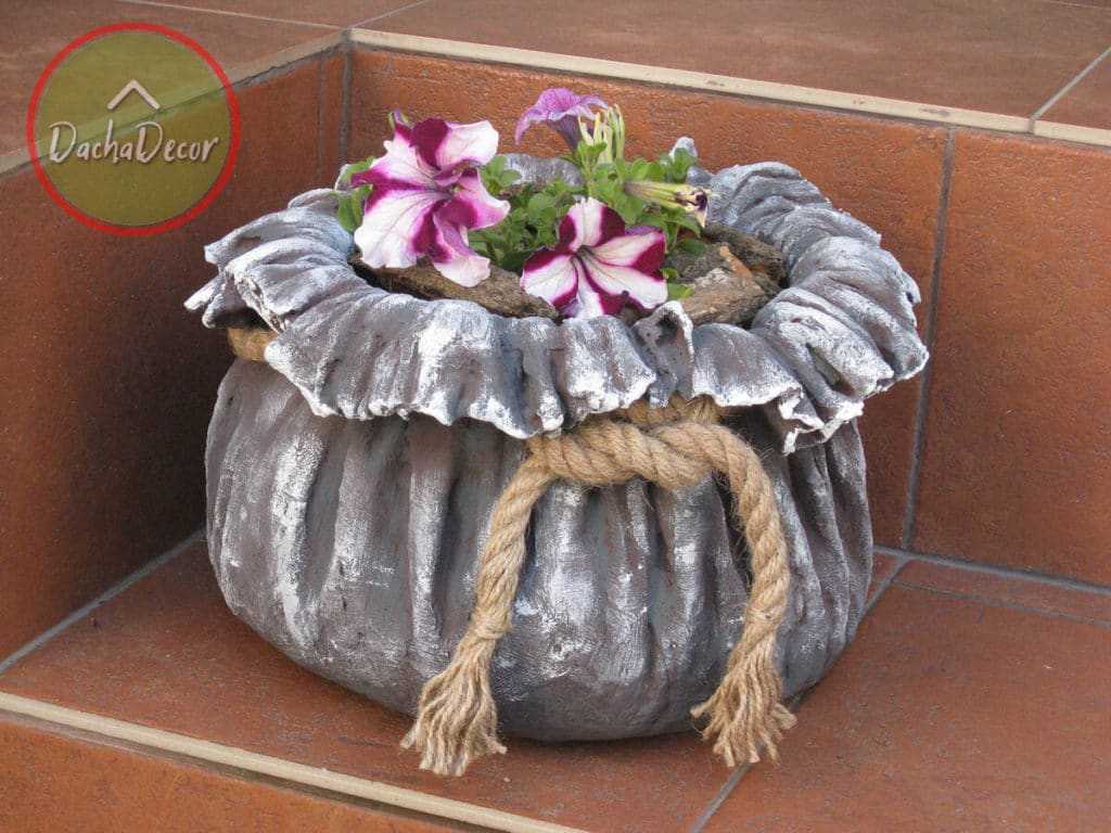 Чтобы изготовить такой вазон потребуется пластиковая емкость из под краски, ткань соответствующего размера, и кусок веревки. Сначала необходимо пропитать ткань цементным раствором, обернуть емкость и подвязать край материала с помощью шнура вдоль верхней части формы. Излишки ткани следует обрезать по периметру.