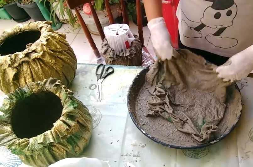 Лишние части ткани обрезали. Ткань замочили в воде и, выжав, поместили в заранее подготовленный цементный раствор.