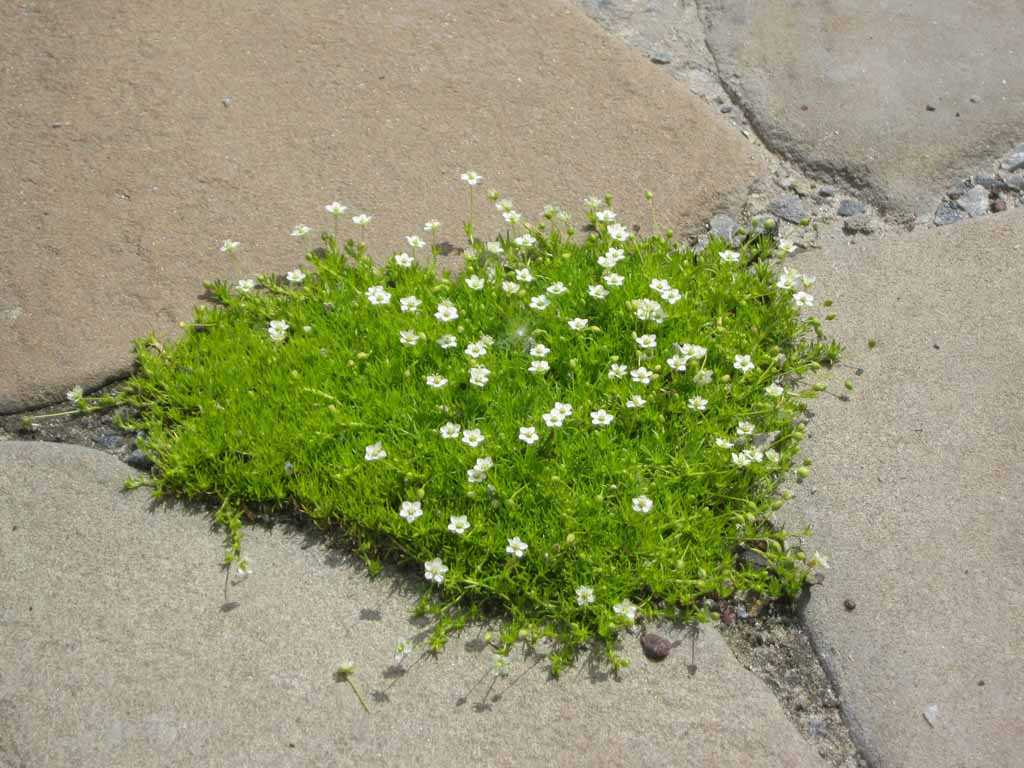 - Прополка чаще всего не требуется, так как сорнякам не даёт прорастать плотный покров мшанки. Если они всё-таки появились, их следует удалить.