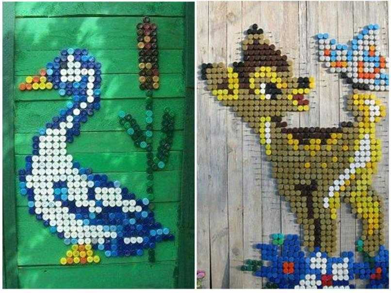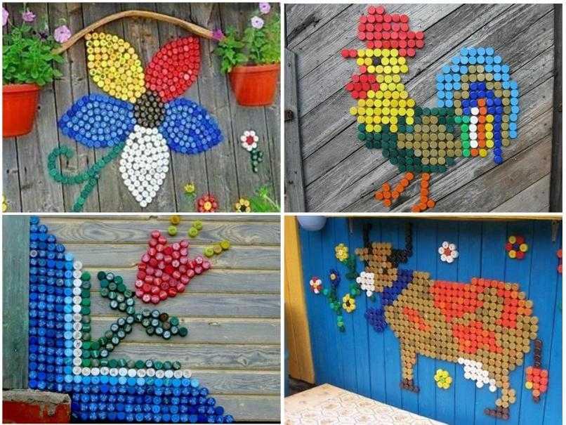 Из крышек можно изготовить панно-композицию на стене дома, сарая, забора на детской игровой площадке. Инструкция по созданию поделки из крышек пластиковых бутылок: