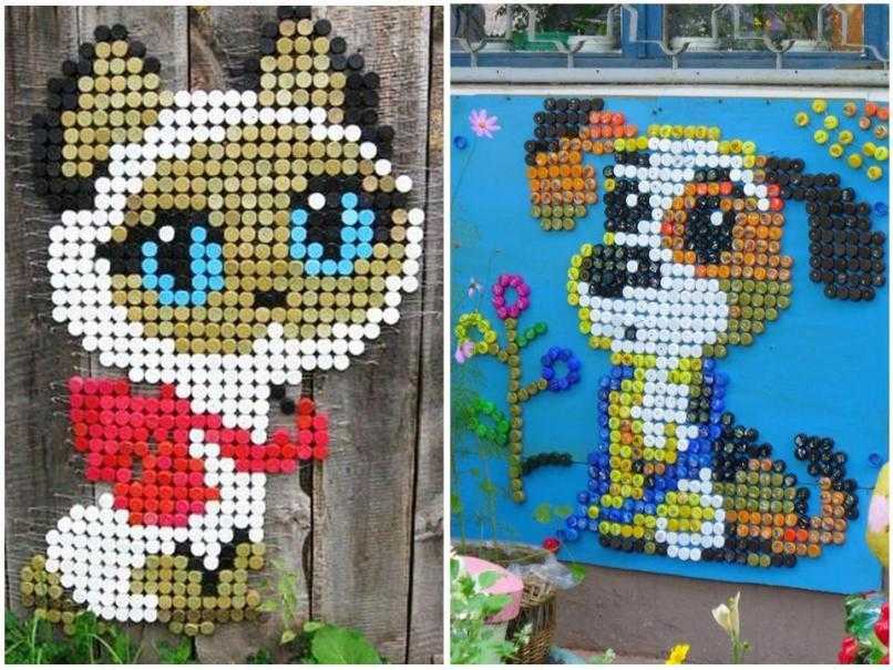 Широкое разнообразие цветов крышек от пластиковых бутылок позволяет сделать, практически, любой рисунок. Можно реализовать идеи, представленные ниже, или воспользоваться простыми схемами для вышивания крестиком. Особенно интересно сделать своими руками новую картинку. Приводим короткий мастер-класс изготовления украшения. Сначала на бумаге или экране компьютера на рисунок наносится сетка с шагом, соответствующим размеру крышек. Затем каждому квадратику подбирается пробка наиболее подходящего цвета.