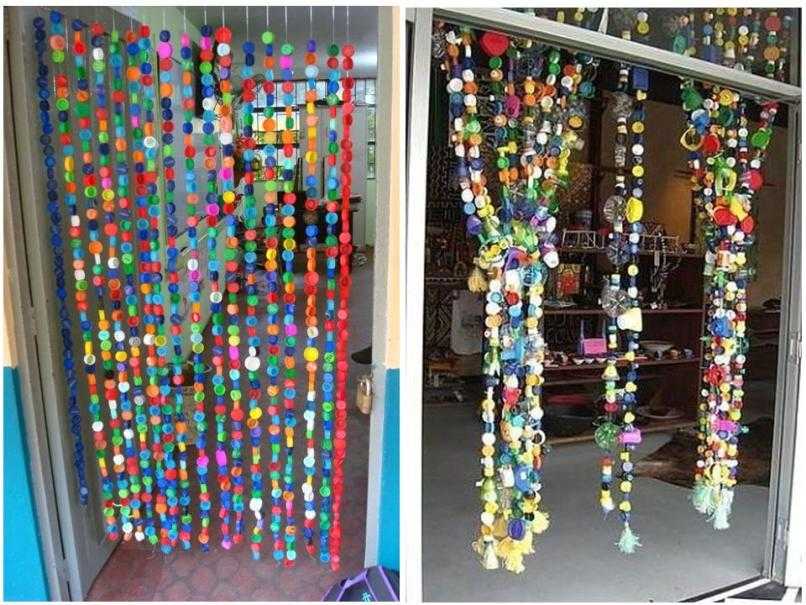 Оригинальные и яркие шторы для дачи – еще один вариант использования пробок от пластиковых бутылок. Согласитесь, большое количество материала лучше приобрести на оптовой базе или заказать через Интернет.
