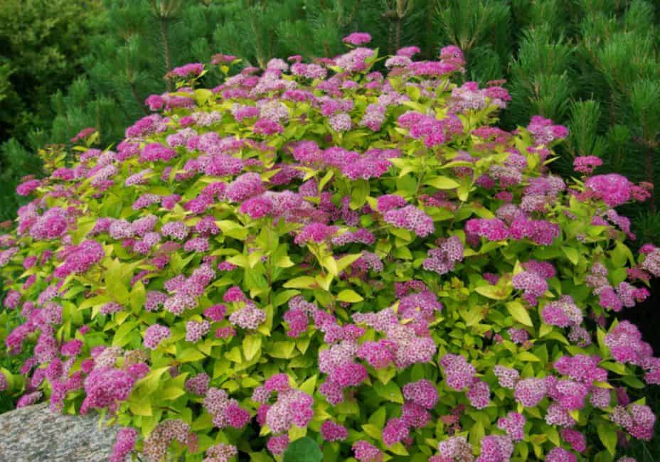 - спирея японская Голд Маунт – это спирея японская маленькая, высотой всего 25 см, с яркой желто-золотистой листвой и розовыми цветками;