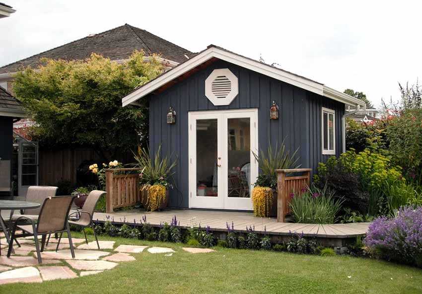 - Украшаем построенный своими руками сарай для дачи при помощи вазонов с цветами, подделок и т.д.