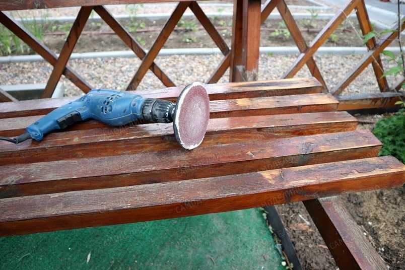 Шлифование бруса перед тем, как покрасить садовую скамейку из дерева