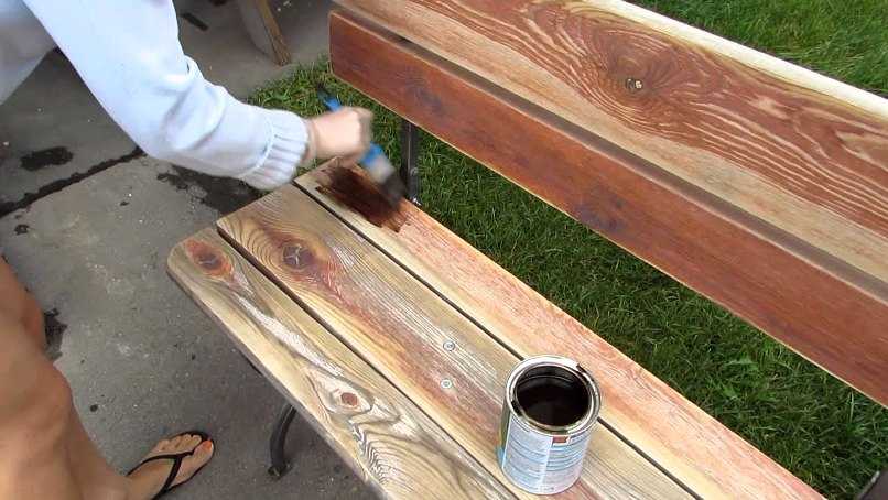 В течение суток древесина хорошо просыхает и не успевает запылиться. Можно покрывать скамейку морилкой, лаком и краской, как было указано выше. Морилкой покрываем только очищенные до дерева участки, лаком и краской обрабатываем все поверхности.