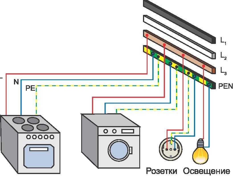 В системе TN-C-S, подобно TN-C, от трансформатора идет общий провод PEN. В домашнем щите его разделяют на нулевой N и заземляющий PE, соединяют с общей шиной. Схема используется с трехфазной сетью питания. В однофазной прокладывают дополнительный третий провод от розеток ко входному распределительному щитку.