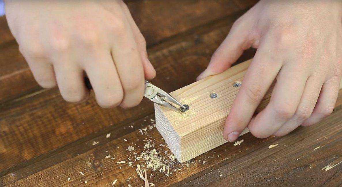 При этом на начальном этапе выкручивания плоскогубцы держат под углом 45°, когда же шляпка покажется из поверхности древесины, можно выкручивать шуруп, держась за его резьбу.