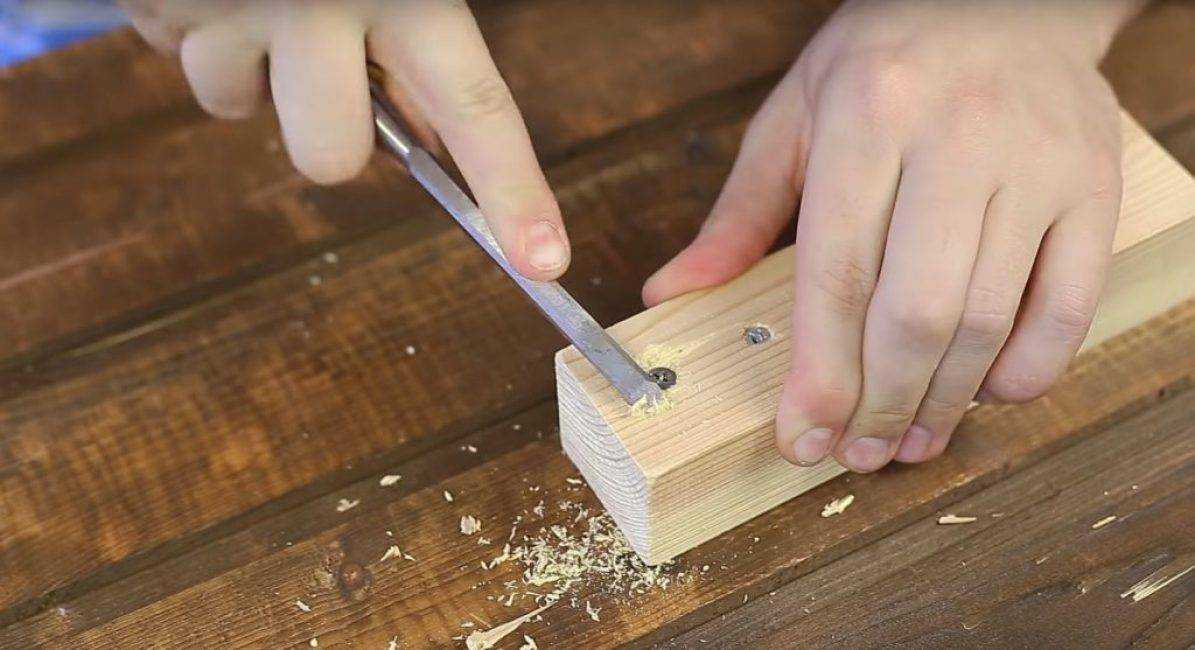 При помощи стамески или долота обрабатывается деревянная поверхность, находящаяся в районе шляпки шурупа