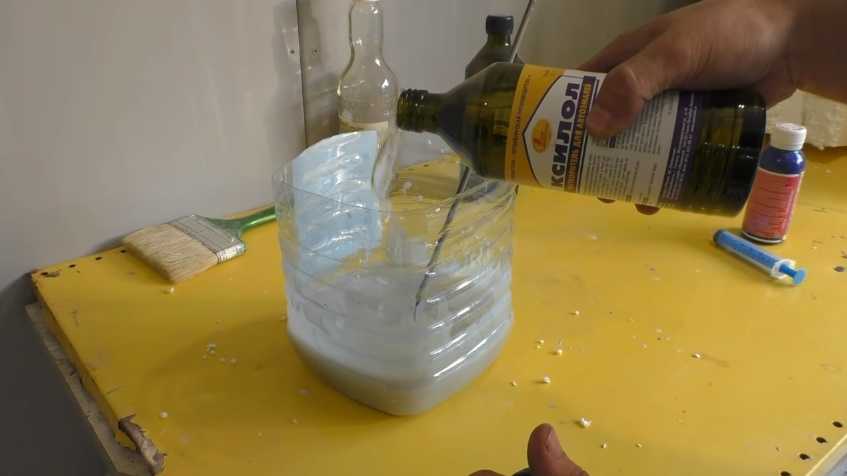 Как и в предыдущем случае, пенопласт загружается в лак-ацетоновую смесь небольшими порциями и тщательно вымешивается, чтобы избавиться от пузырьков и добиться полного растворения пенополистирола.