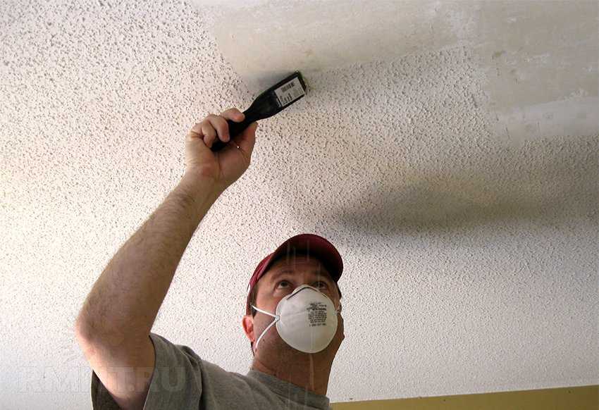И самый радикальный способ избавления — удаление при помощи кислоты. Работать нужно при полной защите: очки, маска, перчатки и костюм. Уксусную кислоту маленькими порциями добавляйте в воду. На объем воды должно быть не более 3% кислоты. Порядок именно такой: вода, затем маленькие порции кислоты, иначе она вступит в реакцию. Кистью нанесите раствор на потолок и затем удалите покрытие шпателем или щеткой. Поверхность потолка обязательно промывается мыльным раствором.