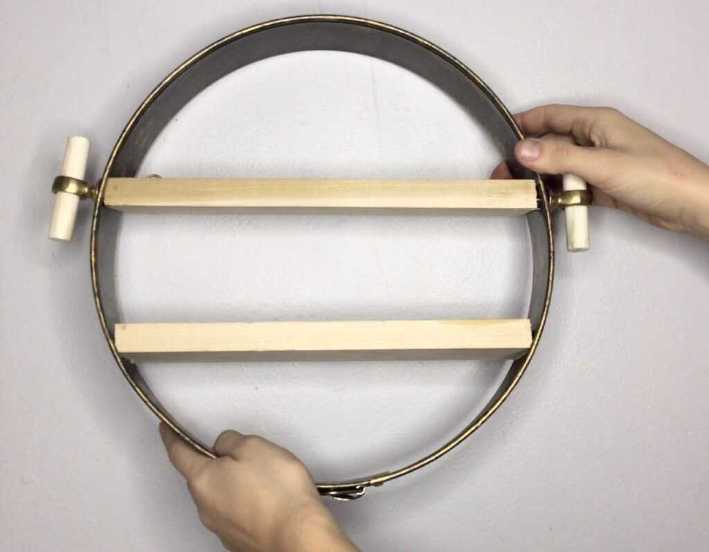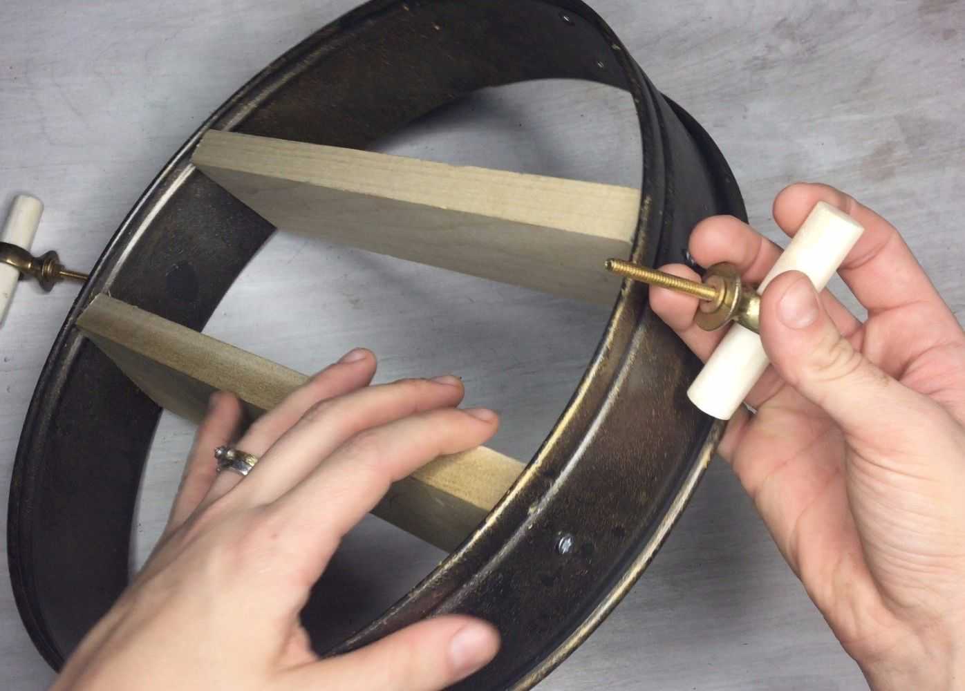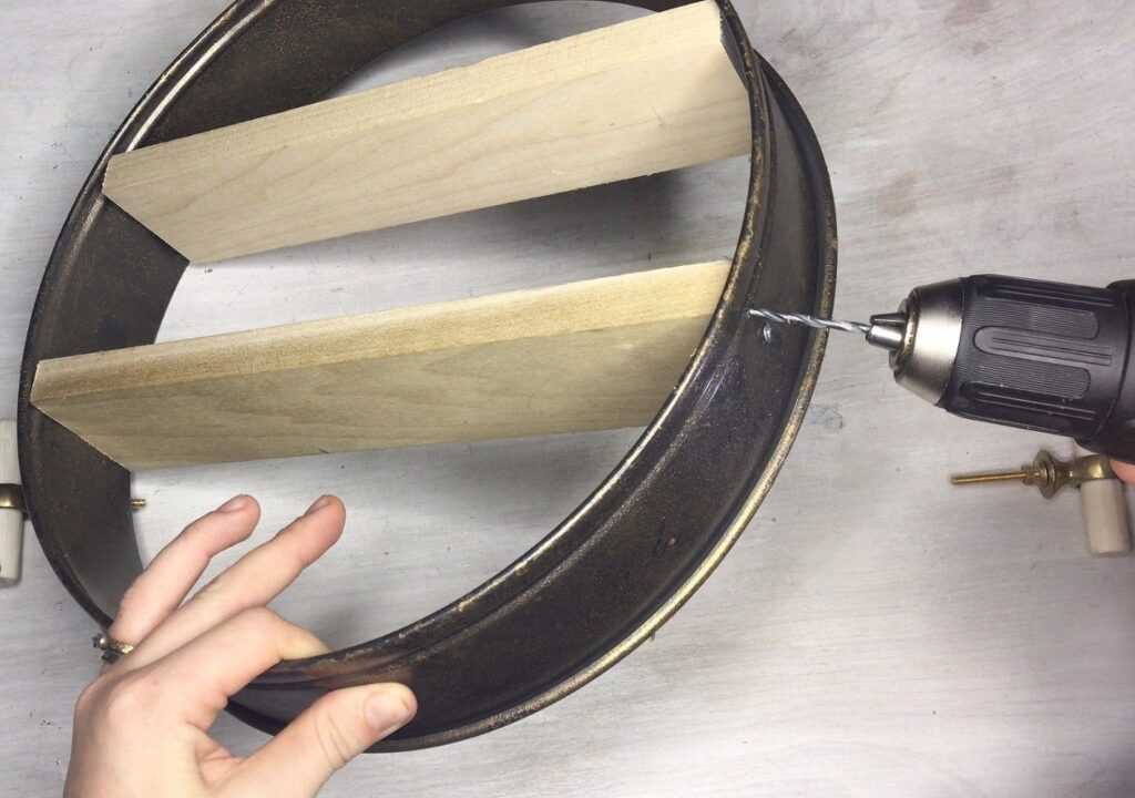 Уложите полки внутри металлического обруча. просверлите отверстия с обеих сторон полок и закрепите их при помощи шурупов.